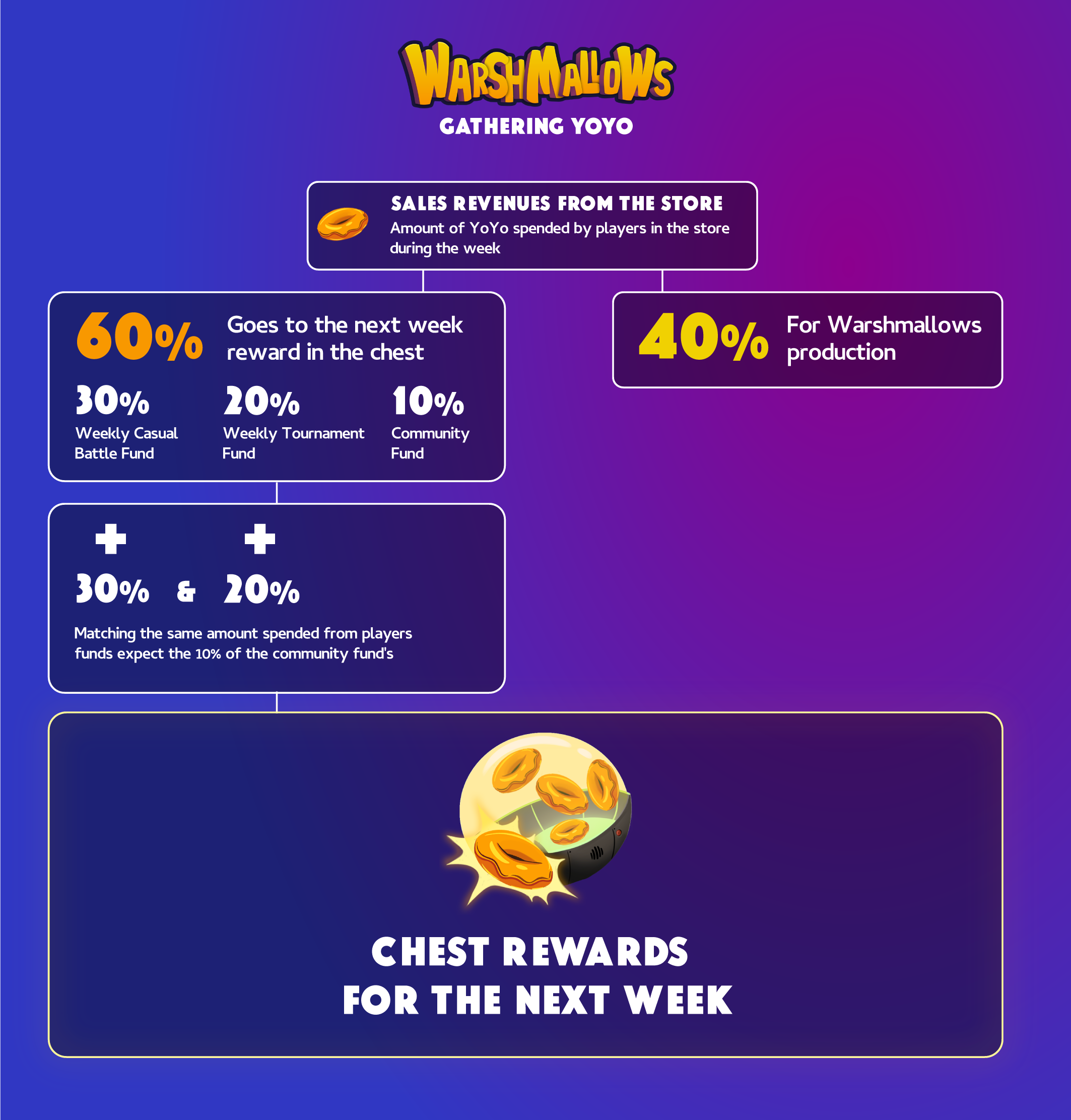 Basically, **60% of the in-game store sales in YoYo** in one week are redistributed as battles and tournament rewards for the next week. To make it more interesting, we match almost the same amount from the [player's fund](https://yourun-ltd.gitbook.io/warshmallowsworld/welcome/the-yoyo-coin/yoyo-allocation).&#x20;