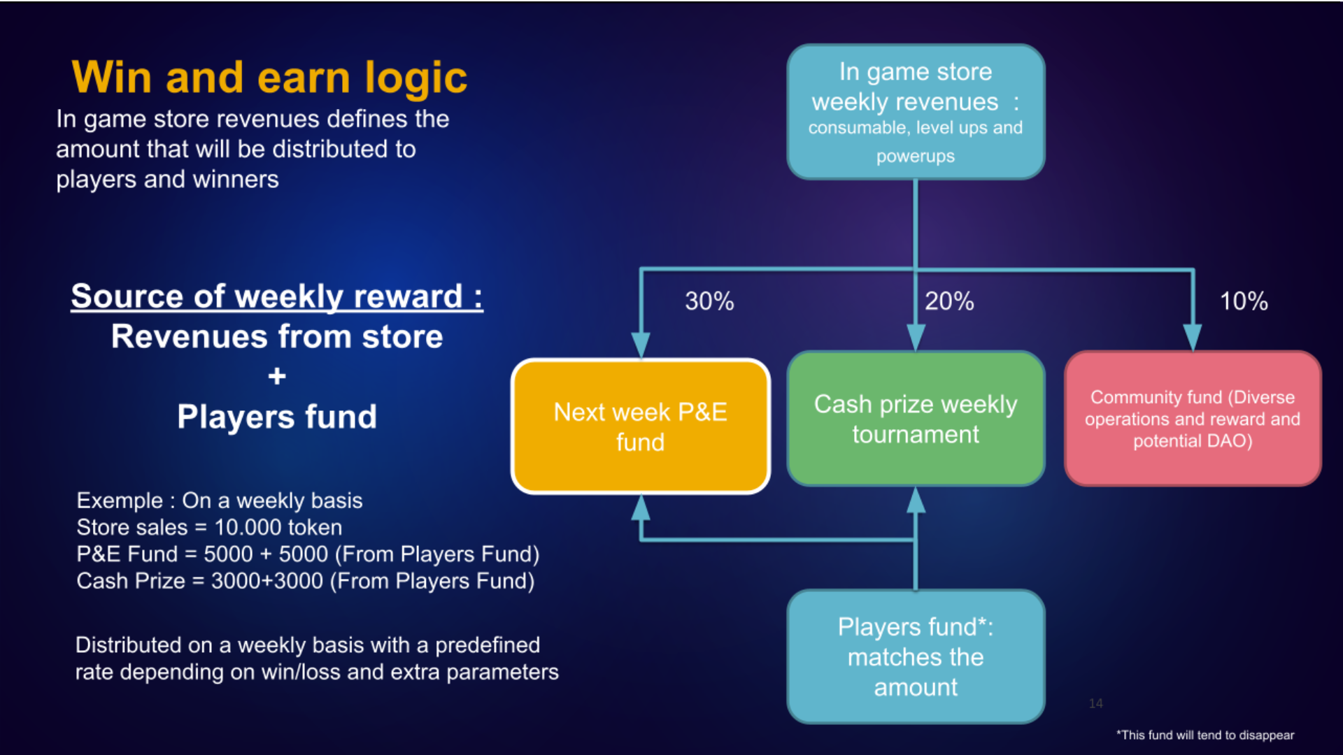 <table><thead><tr><th width="206">Name</th><th width="133">% from weekly store revenues </th><th width="118.33333333333331">Amount of YoYo from store sales</th><th width="90">Players fund</th><th width="193.66666666666674">Total amount of YoYo for next week in the chest</th></tr></thead><tbody><tr><td>Weekly casual battle fund</td><td>30%</td><td>30,000</td><td>30,000</td><td>60,000</td></tr><tr><td>Weekly tournement fund</td><td>20 %</td><td>20,000</td><td>20,000</td><td>40,000</td></tr><tr><td>Community fund </td><td>10 %</td><td>10,000</td><td></td><td>10,000</td></tr></tbody></table>